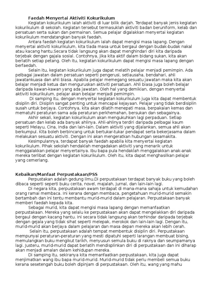 Karangan kebaikan menyertai aktiviti kokurikulum. Kokurikulum terdiri daripada persatuan permainan dan unit beruniform. Ipendidikan karangan kebaikan dan faedah menyertai aktiviti kokurikulum disemak dan dikemaskini pada pukul 8 17 pm 4 mei 2020 tajuk soalan karangan bahasa melayu yang bertemakan pelajar sekolah sering kali menjadi pilihan pembuat soalan. Unknown 1 july 2018 at 18 50.