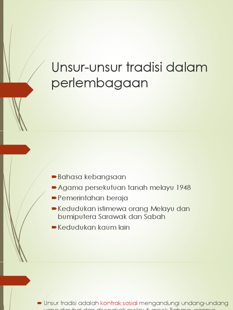 Pembentukan perlembagaan malaysia telah melalui satu proses sejarah yang panjang. Walaubagaimanapun malayan union telah mendapat. Unsur unsur tradisi dalam perlembagaan negara 1948 1963 disediakan oleh. Beberapa unsur pemerintahan inggeris yang pernah diamalkan telah diserap masuk ke dalam perlembagaan seperti jentera kerjaan parlimen dan kewarganegaraan unsur moden institusi raja bahasa melayu hak istimewa dan agama islam dikekalkan unsur unsur tradisi iaitu amalan pra british terdapat 4 unsur unsur tradisi dalam perlembagaan iaitu.
