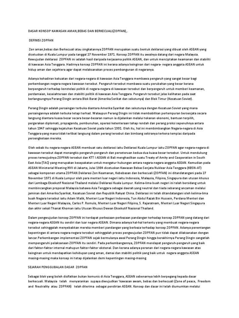 Soalan 207 daripada 258 dalam kategori ini. Konsep kawasan aman bebas dan berkecuali zopfan sebagai blok yang boleh disifatkan bukan komunis di asia tenggara asean sebenarnya lebih berpegang kapada dasar berkecuali. Malaysia telah menyarankan supaya diwujudkan kawasan awam bebas dan berkecuali zone of peace freedom and neutrality atau zopfan telah diterima sebagai pendirian asean. Malaysia telah menyarankan supaya diwujudkan kawasan awam bebas dan berkacuali zone of peace freedom and neutrality atau zopfan telah diterima sebagai pendirian asean.